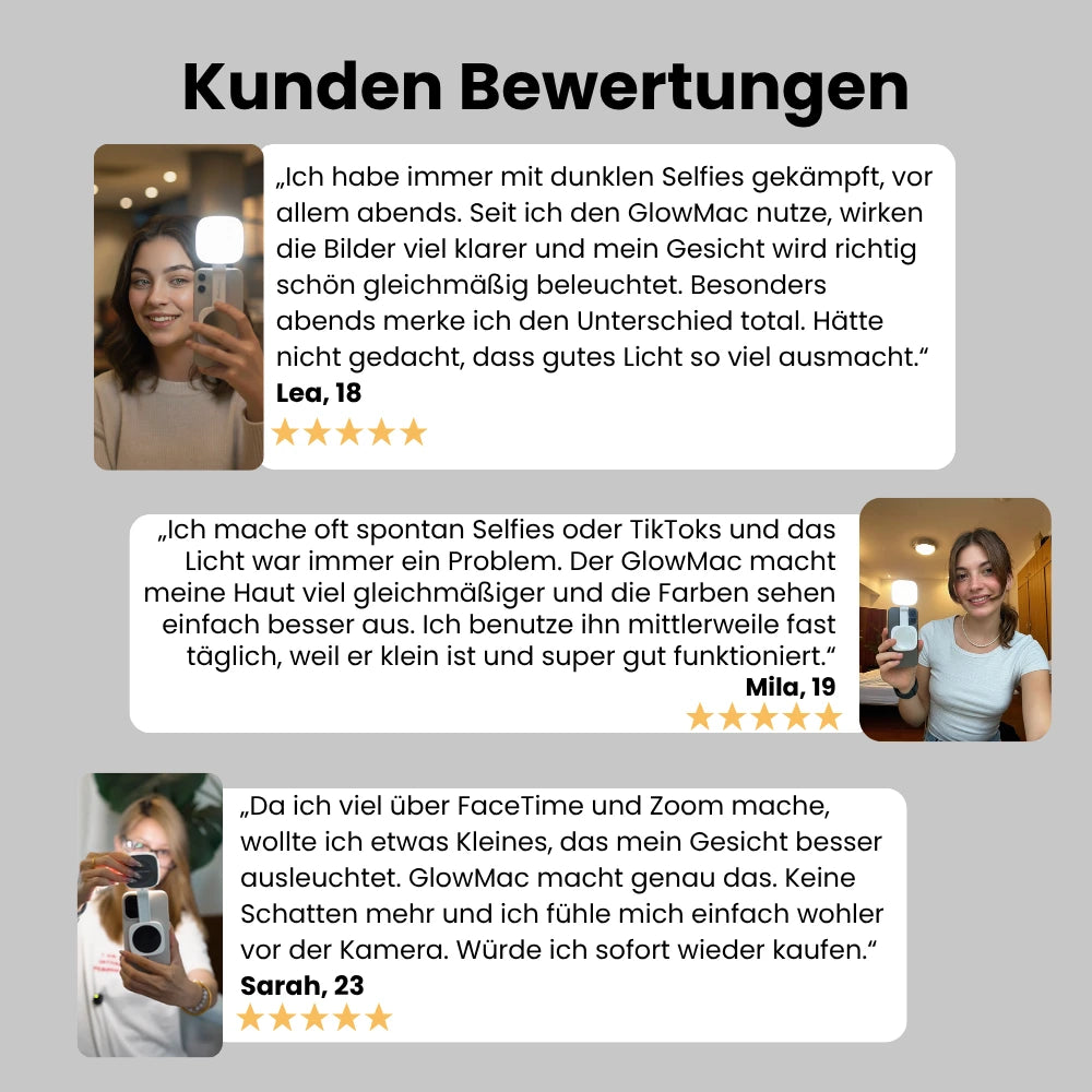 Ich bin wirklich begeistert vom GlowMac. Das Licht macht einen riesigen Unterschied bei Selfies und TikToks. Absolute Empfehlung!